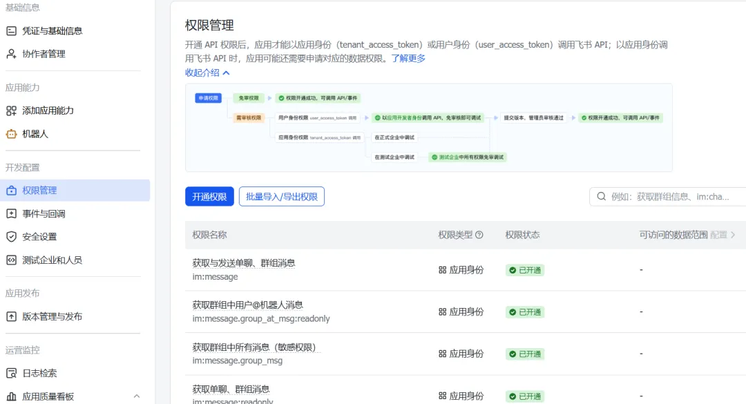 4 | 添加权限:im:message、im:message:send_as_bot、im:message:readonly、im:message.p2p_msg:readonly、im:message.group_at_msg:readonly