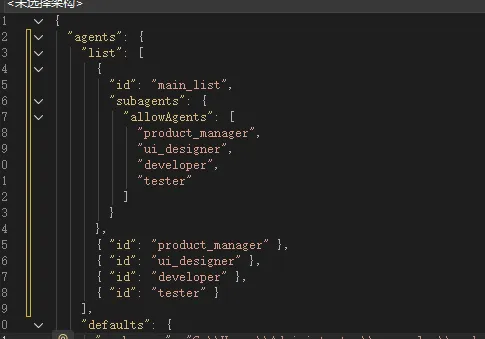 {"agents": {"list": [{"id": "main_list","subagents": {"allowAgents": ["product_manager","ui_designer","developer","tester"]}},{ "id": "product_manager" },{ "id": "ui_designer" },{ "id": "developer" },{ "id": "tester" }]}}