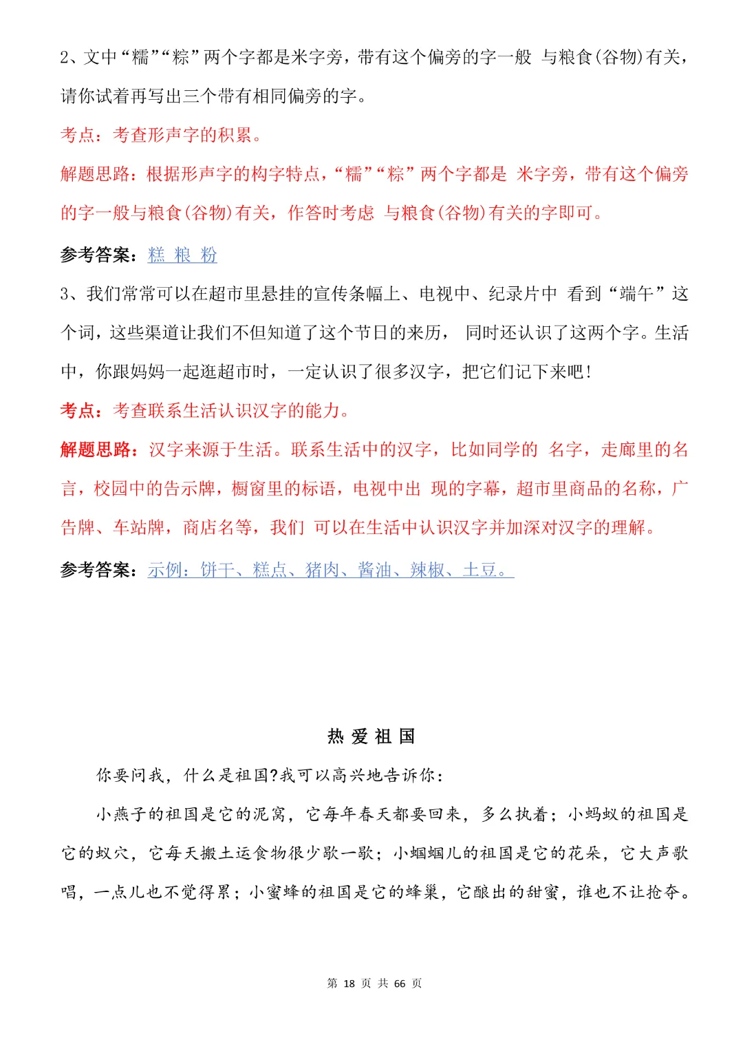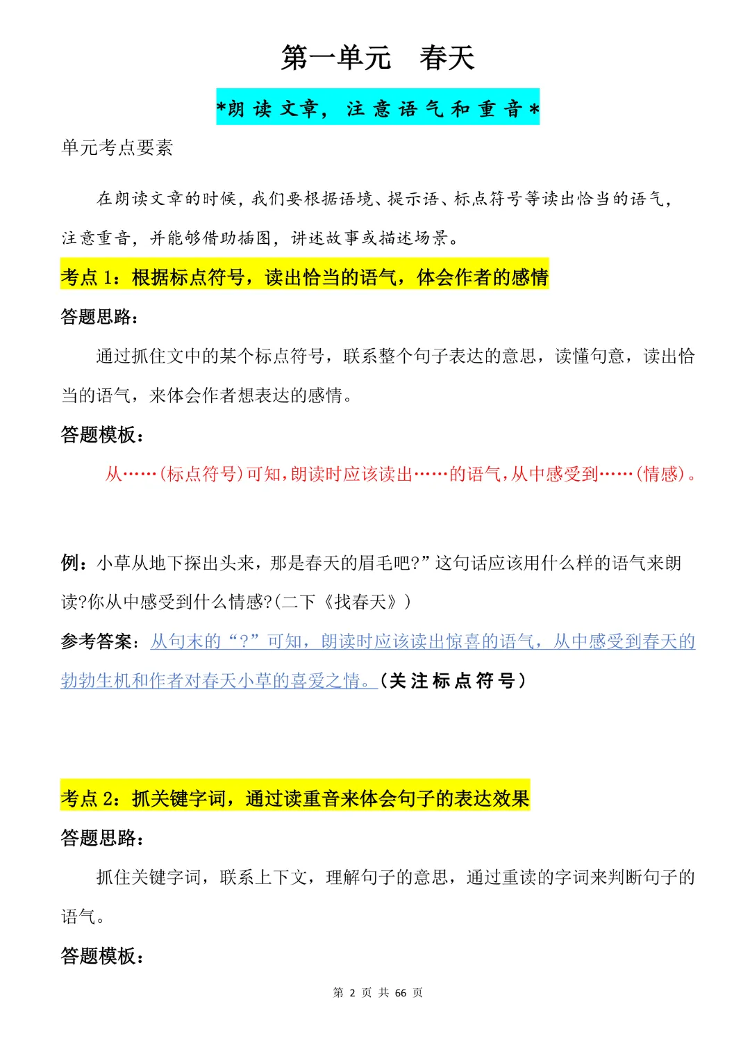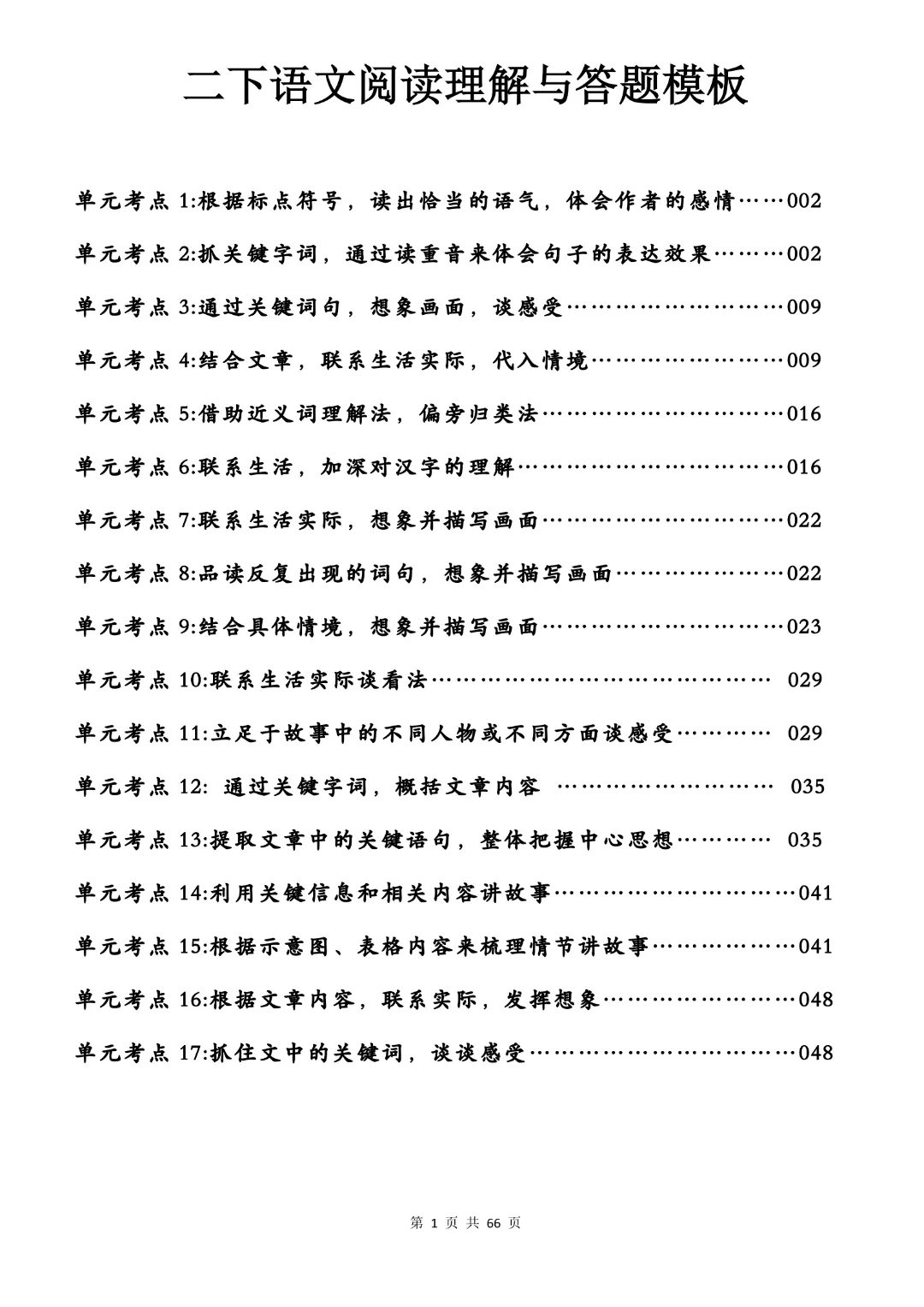 今天给家长们分享的是:二年级下册语文人教版《阅读理解与答题模板17大单元考点》| 完整高清电子版可打印