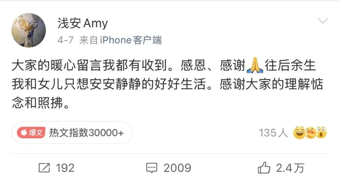 第一条,面向全网的惦念:“大家的暖心留言我都有收到。感恩、感谢。往后余生,我和女儿只想安安静静的好好生活。感谢大家的理解惦念和照拂。”