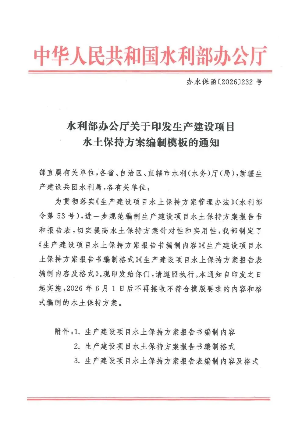新版《生产建设项目水土保持方案编制模板》来了,办水保函〔2026〕232号新鲜出炉! 需要交流学习或者下载资料的可以加群: (1)微信群26个,可以加编辑微信:Dummer797i,拉你进群! (2)QQ群11个:1-9群已满,请加10群和11群:947078459、1018401753),到群文件夹中下载文件即可。来源:水利部