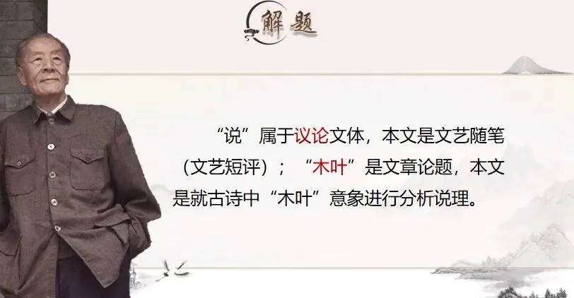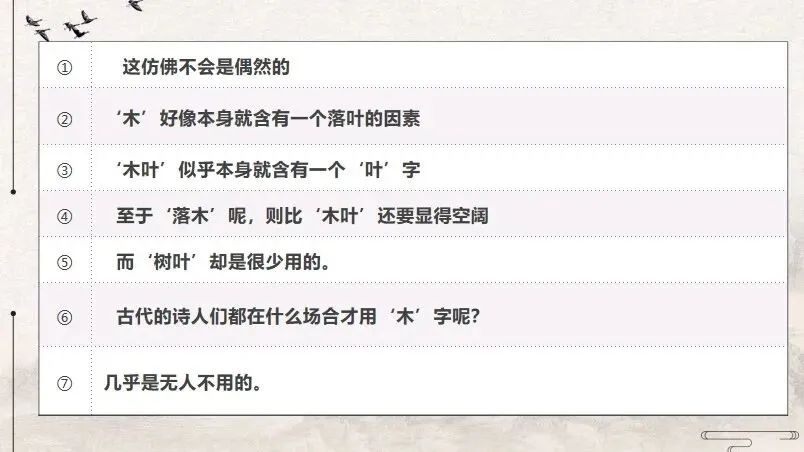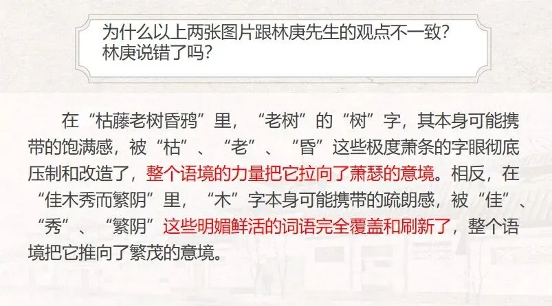 师: 太棒了!这就是语境的力量!林庚先生从“木叶”、“高木”、“落木”中提炼出的,是“木”这个字本身所携带的潜在可能性,一种倾向性的暗示。