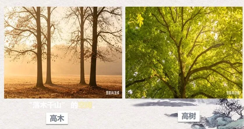 生2: 颜色不一样。“高树”是绿色,是湿润的。“高木”是黄褐色,土地也干干的,像是秋天。
