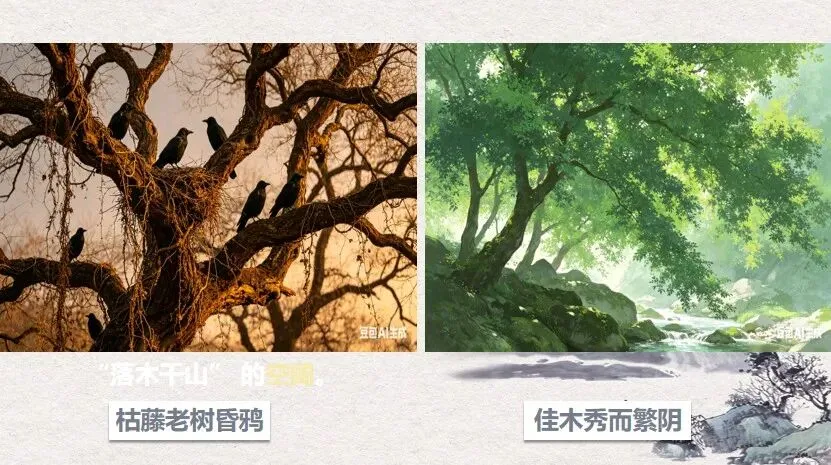 请大家看这组图片。我给了AI两句诗作为提示词。第一句是“枯藤老树昏鸦”,大家非常熟悉。第二句是“佳木秀而繁阴”,出自欧阳修的《醉翁亭记》。请大家仔细观察AI根据这两句诗生成的画面。