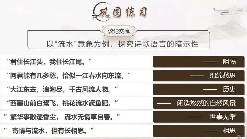 现在,我想把这把钥匙交给你们。我们一起分析“梅”、“柳”、“鸿雁”、“孤舟”……这些经典的诗歌意象的暗示性。