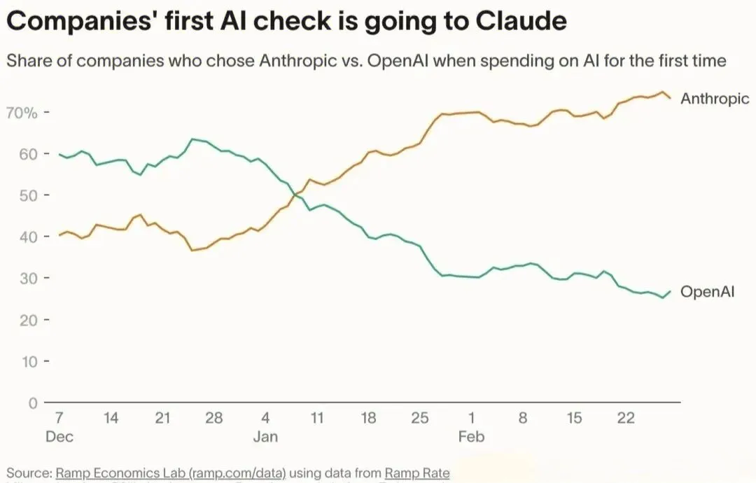 更火爆的是,根据Ramp的最新报告:在首次购买AI服务的企业里,Anthropic在与OpenAI的正面对决中,胜率高达 70%。看趋势,将来大有反超OpenAI坐头把交椅的趋势。
