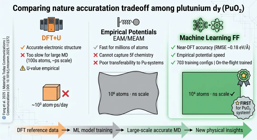 Fang等人开发的PuO₂ MLFF填补了一个此前长期存在的模拟能力空白。在此之前,研究者若要对含PuO₂体系进行大规模原子模拟,只能在以下选项中做出妥协:使用DFT直接做AIMD——但受限于计算成本只能模拟几百个原子在几十皮秒时间尺度内的行为;或者使用为UO₂开发的经验势函数(如Morelon势、Basak势等)勉强套用于PuO₂——但由于Pu 5f与U 5f的电子结构差异显著,这类套用的可靠性难以保证。