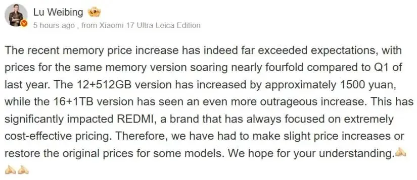 小米集团总裁卢伟冰在微博发文,解释 REDMI 新机涨价原因:内存价格上涨远超预期。