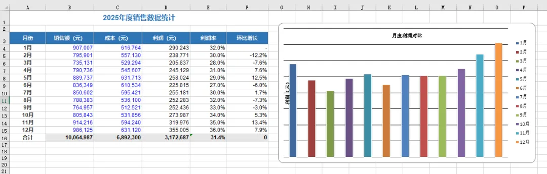 我让它做一份"月度销售数据表",包含销售额、成本、利润、环比计算。
