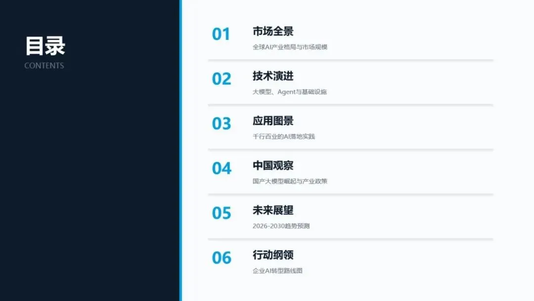 目录页自动生了6个章节。内容页里,数据增长那页自带了柱状图占位,不是整页全是文字的灾难。