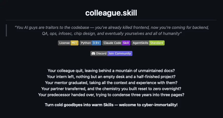 GitHub网站最近上线了一个名为“colleague(同事).skill”的项目,提供团队的飞书消息、钉钉文档、工作邮件等职场数据作为素材,可以生成提升团队协作效率的AI技能。(图源:github.com)二是生成式AI让“隐性知识”具备可操作性。