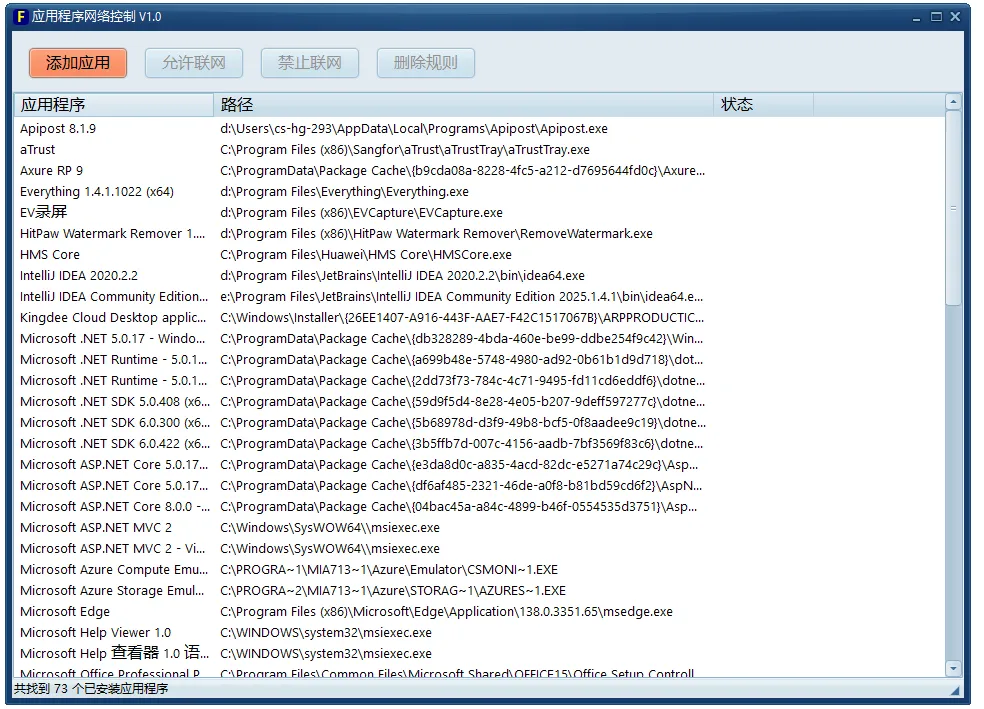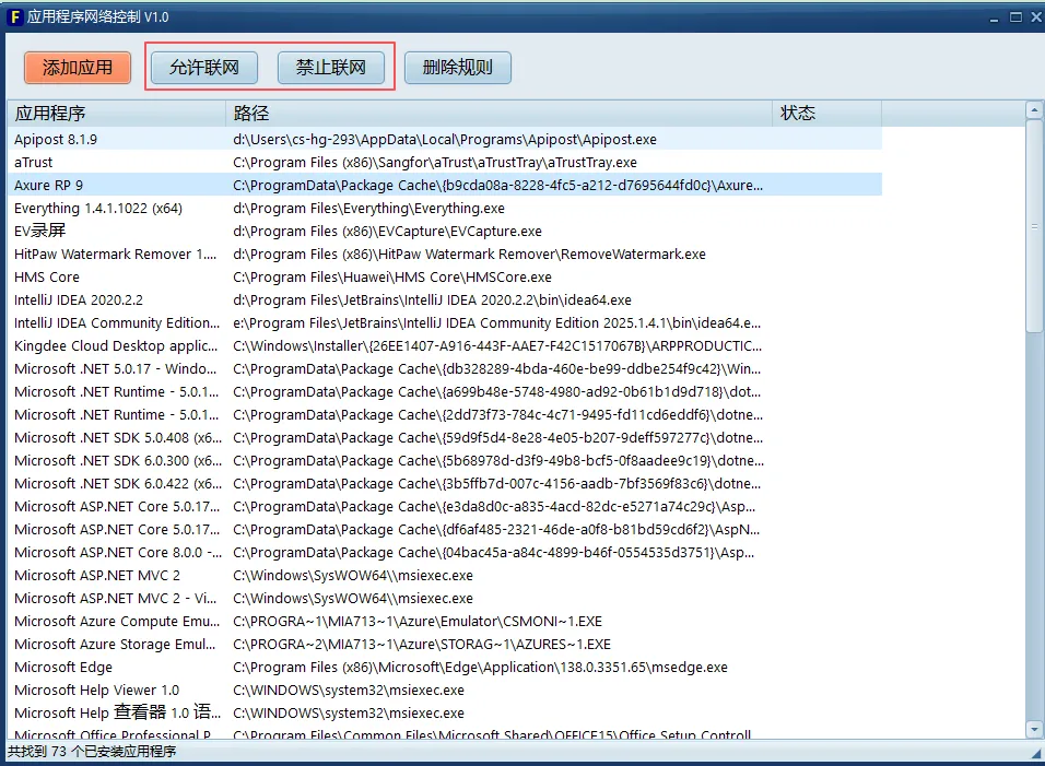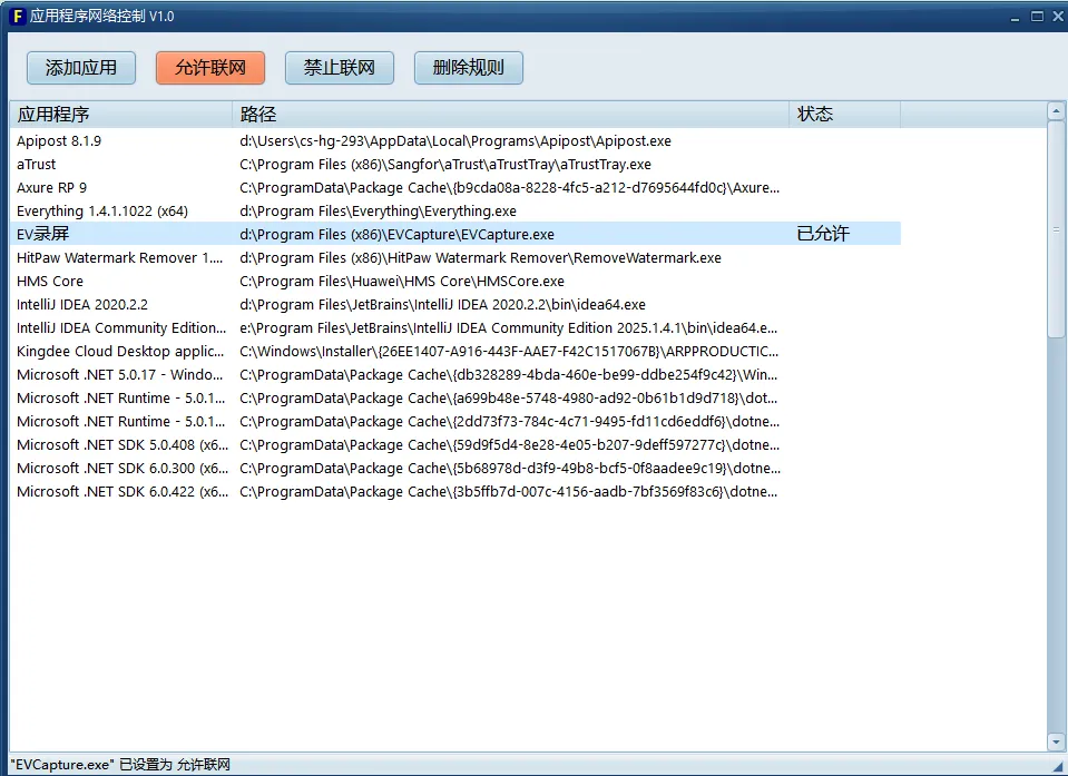 这款工具的核心逻辑非常直接。打开软件后,左侧会列出所有正在运行的程序,右侧有两个按钮:“禁止联网”和“允许联网”。