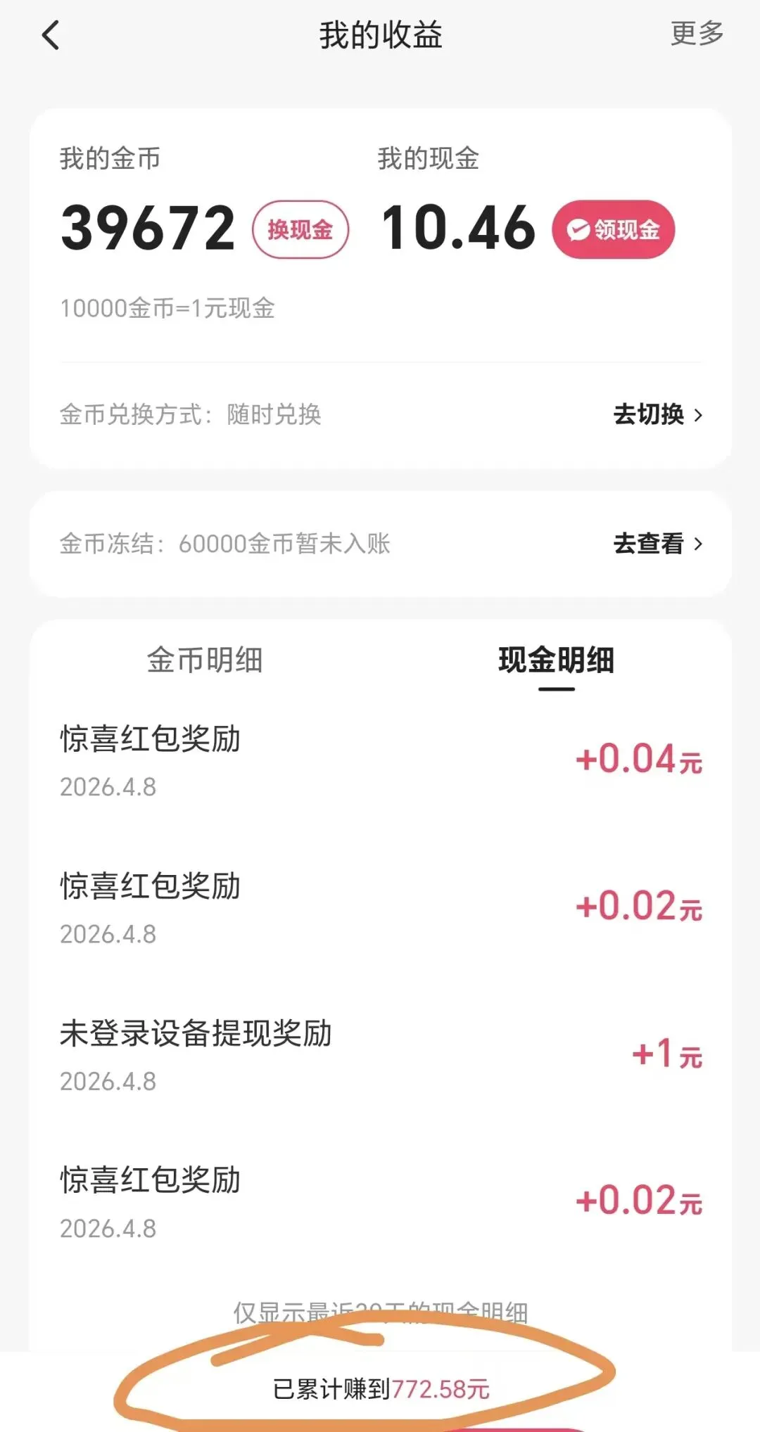 比如快手极速版,不知不觉,我已经在这个软件累积薅了772.58的羊毛(见下图)。你敢信吗?要不是亲眼看着自己手机里的记录,我都不敢相信这是真的。看到日积月累的力量了吧。
