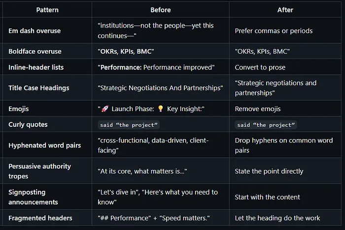 该技能可检测29种特征:意义夸大(“标志着……发展的关键节点”)、系动词回避(用“充当”代替“是”)、破折号滥用、谄媚语气、三段式排比等。每种模式都配有修改前后示例,让你清楚优化逻辑。