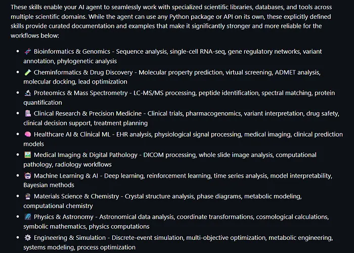 每个技能都附带所需Python包,例如分子分析用RDKit、单细胞基因组学用Scanpy、药物研发机器学习用DeepChem。