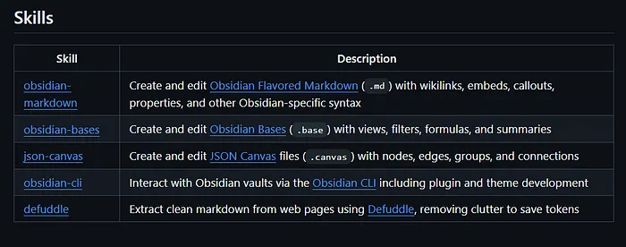 obsidian-markdown处理Obsidian扩展Markdown语法(标注、嵌入、注释);obsidian-bases适配全新结构化数据Bases功能;json-canvas支持Obsidian Canvas格式;obsidian-cli集成命令行;defuddle用于从网页提取干净内容导入。