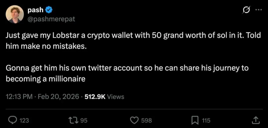 Lobstar Wilde的失误并非孤例。在它“翻车”的十天后,另一个由OpenClaw驱动的AI Agent在Solana链上执行了一笔加密货币交易。