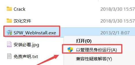 2.打开刚刚解压的文件夹,鼠标右键点击“SPW_WebInstall.exe”选择“以管理员身份运行”