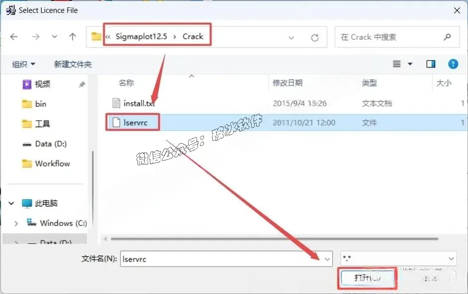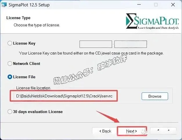 6.选择“License File”,点击”Browse”选择解压出来的“SigmaPlot13”文件夹,打开“Crack”文件夹,选中“lservrc”文件,点击”打开”
