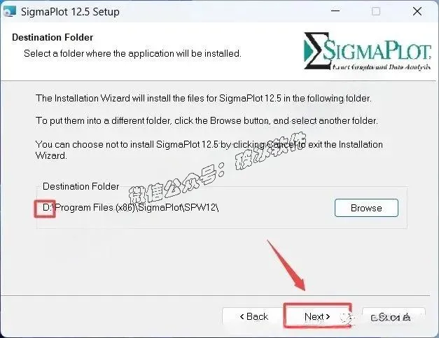 8.选择软件安装路径,建议和教程中的保持一致,本例安装到D盘(将路径地址中的首字符C改为D表示安装到D盘,或者可以在其它磁盘里创建一个新的文件夹,安装路径不要出现中文),点击”Next”