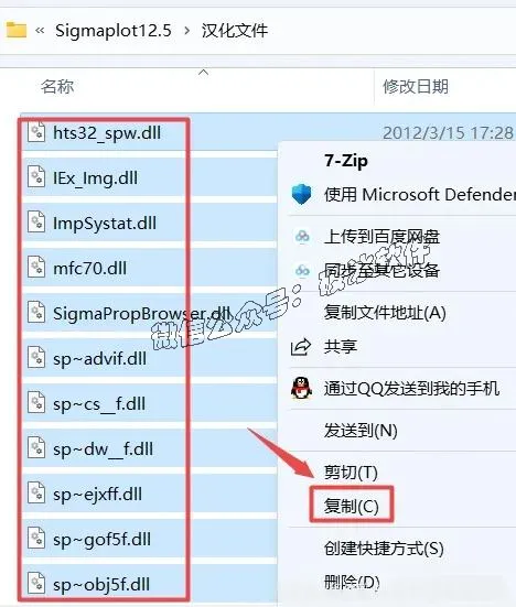 13.返回之前解压出来的“Sigmaplot12.5”文件夹,双击打开“汉化文件”文件夹,选中该文件夹下的全部文件,鼠标右键选择“复制”