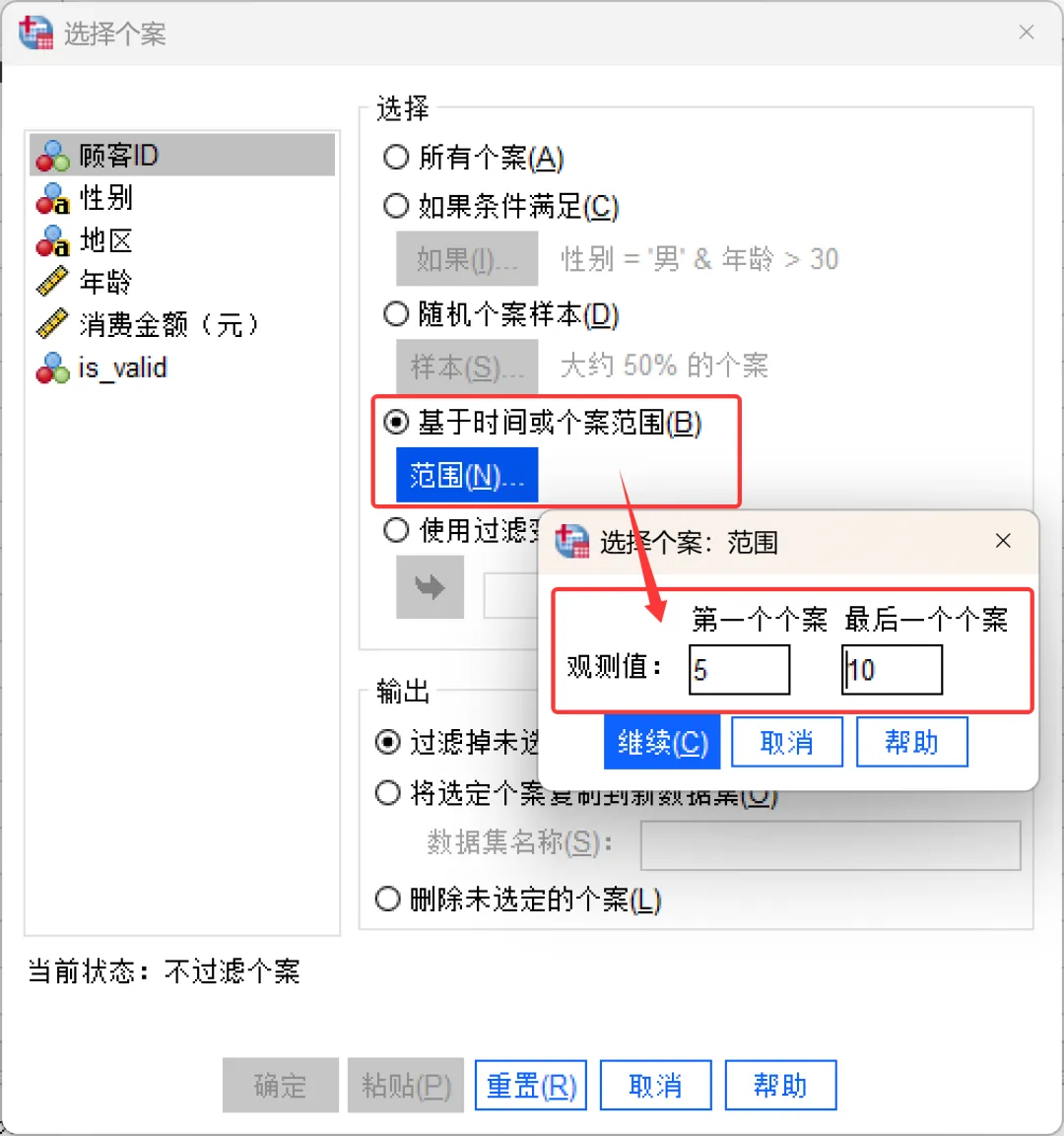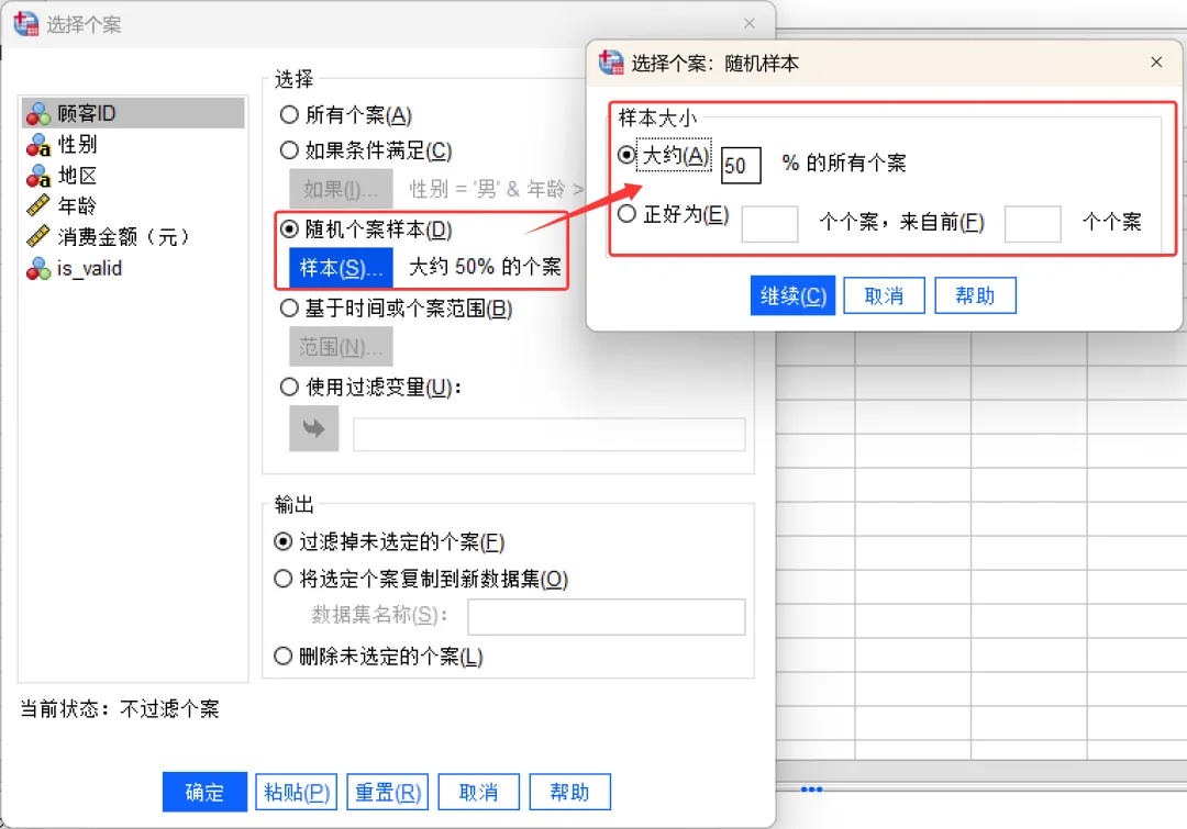完成设置后,点击确定,SPSS会根据设置的条件进行抽样,并选择相应的个案。
