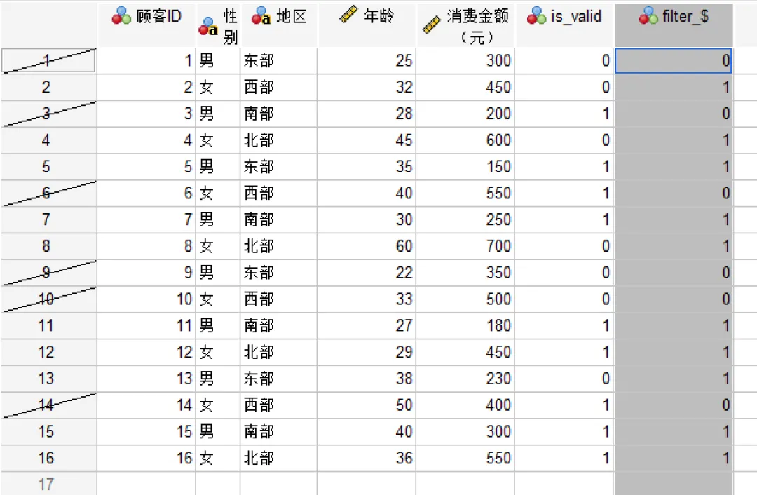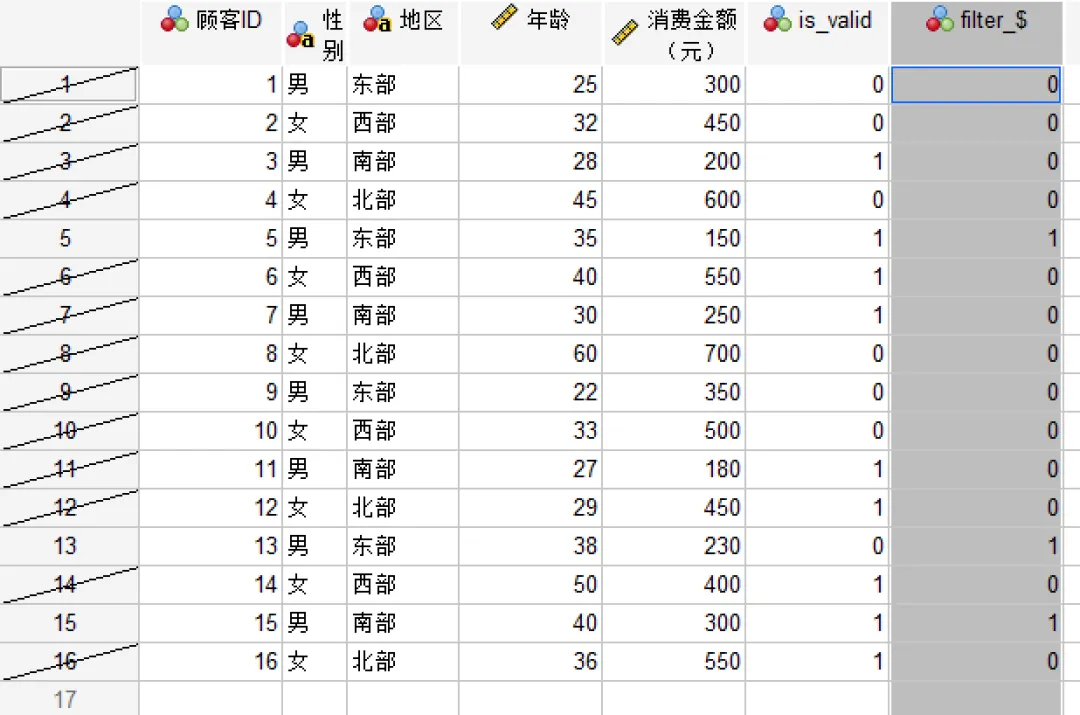 过滤掉未选定的个案:SPSS会保留所有原始数据,但通过一个名为「filter_$」的新变量(值为1表示选中,0表示未选中)来“隐藏”未选中的个案。后续的所有分析(如描述统计、回归、图表等)仅基于被选中的个案,但原始数据完整保留。该方式为默认选项,也是最推荐的做法。 将选定个案复制到新数据集:选中的个案被复制到一个新数据集中,而原始数据集保持不变。 删除未选定的个案:从数据集中删除未被选中的个案,只保留筛选后的数据。需要注意的是,该操作不可逆,一旦执行且未保存原始文件,原始数据将无法恢复。