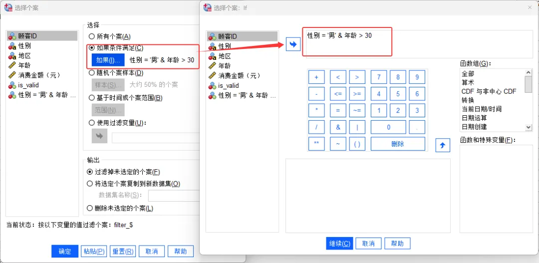 在打开的【计算变量】对话框中,选择「如果条件满足」,点击「如果」按钮,在打开的对话框中的表达式编辑器输入筛选条件,例如本次需要筛选条件为「年龄大于30岁的男性」。