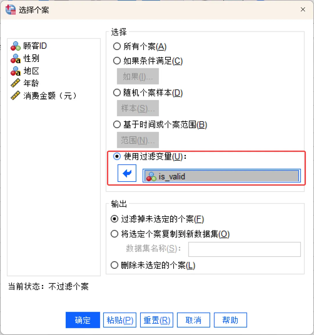 在打开的【计算变量】对话框中,选择「使用过滤变量」,通过箭头按钮指定变量名【is_valid】,后续抽样将自动应用该筛选条件。