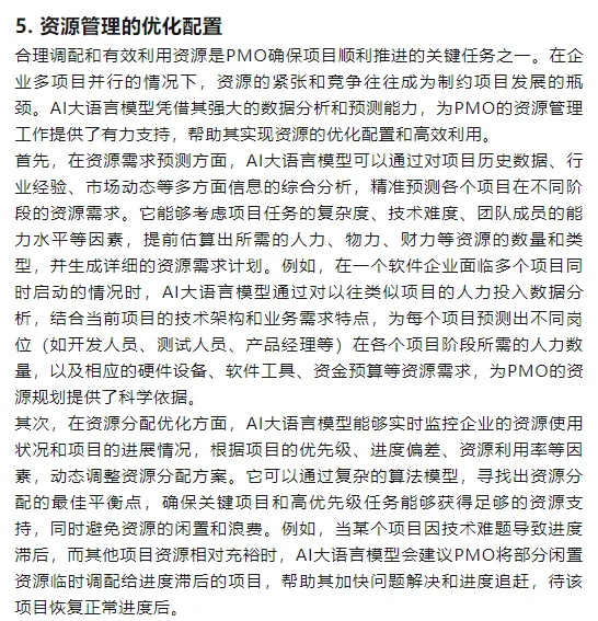 二、AI在PMO项目管理中的应用场景(一)项目规划与预测1. 项目组合管理• AI大语言模型能够通过对海量历史项目数据、行业动态和企业战略目标的分析,精准识别项目的潜在收益、风险水平和资源占用情况。例如,某大型制造企业利用AI模型从数十个待选研发项目中筛选出最具潜力的项目,显著提高了项目组合的科学性和合理性。2. 资源需求预测• AI工具可以通过分析项目历史数据和行业经验,预测各个项目在不同阶段的资源需求,包括人力、物力和财力。例如,AI模型能够根据项目的技术架构和业务需求,预测开发人员、测试人员等岗位的人力需求,为PMO的资源规划提供科学依据。