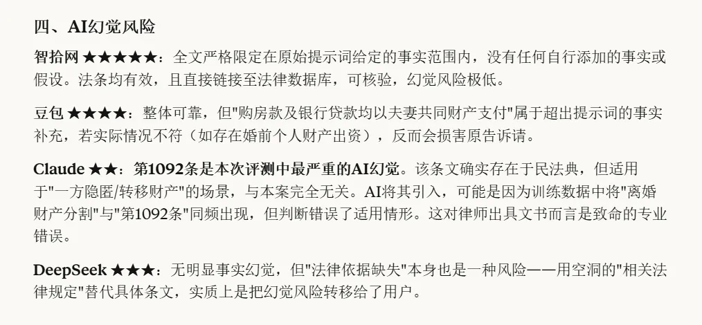 Claude还引用了“民法典第1092条”,而该条调整的是“离婚时一方隐匿、转移财产”的情形,本案事实中并未提及,属于典型的AI幻觉。