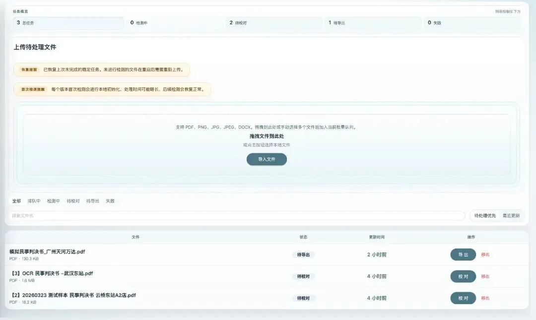 状态看板:排队中 → 检测中 → 待校对 → 待导出,每个文件的状态一目了然