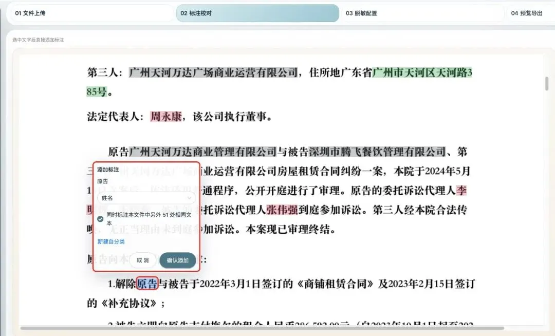 支持相同文本批量操作——标注一处「张三」,系统自动提示「本文件还有 5 处相同的张三,是否一起标注?」