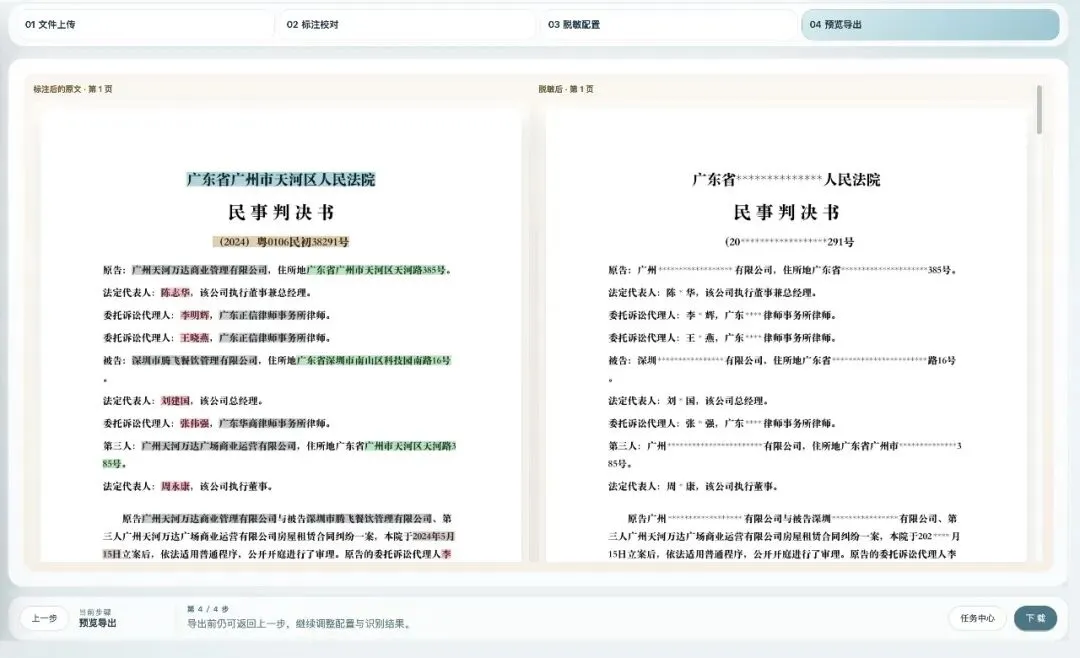 律隐盾在最终导出前提供并排对比预览,左边原文、右边脱敏后结果: