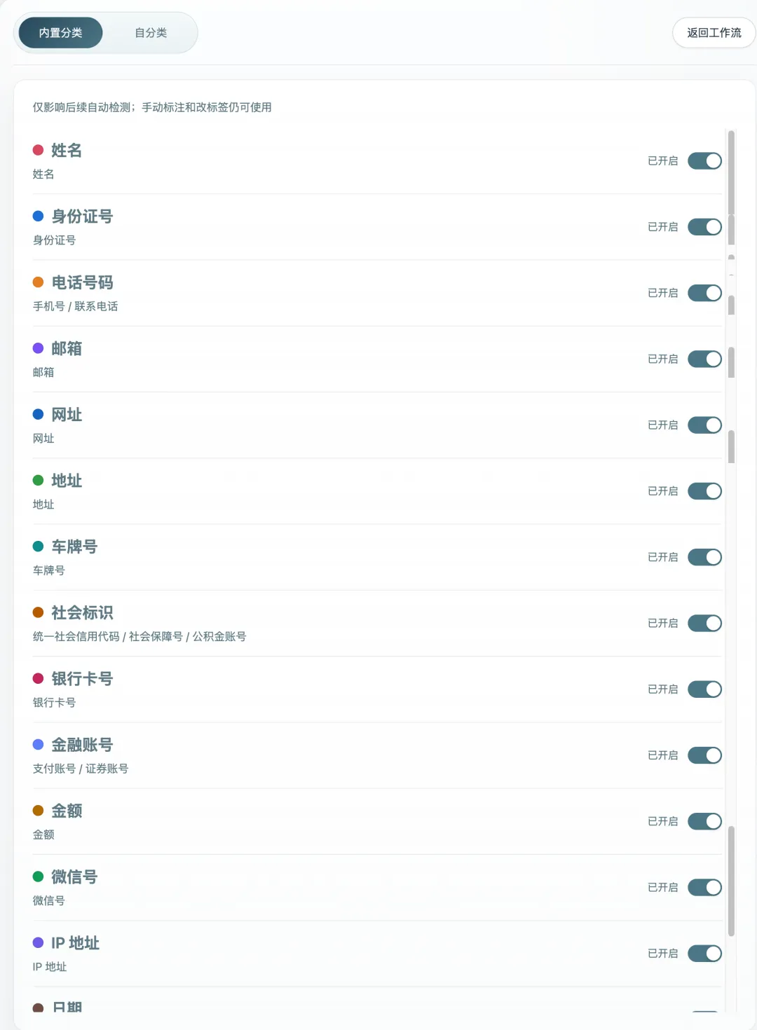 系统预置了 17 大类敏感信息标签,每类都可以独立开关。比如,某些合同场景下金额不需要脱敏,直接关掉即可;下次处理判决书时再打开,互不影响。