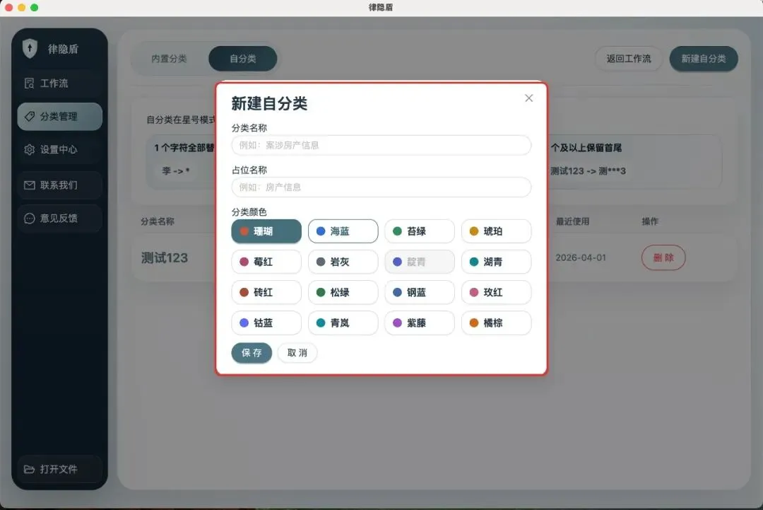 不同律所、不同案件,需要脱敏的信息类型千差万别。律隐盾提供两层标签体系: