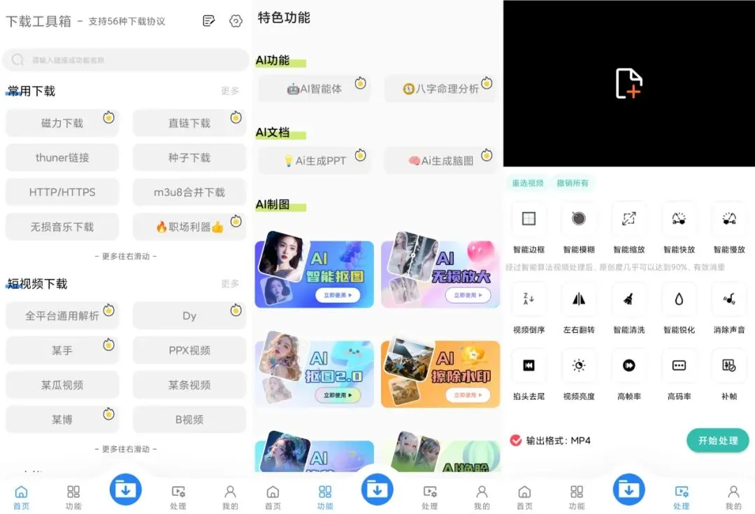 一款支持56种下载协议工具箱,涵盖网络视频解析、资源嗅探、本地视频提取等核心功能;更自带智能清理、高帧率与码率,支持磁力/种子下载、短视频去水印、无损音乐获取。