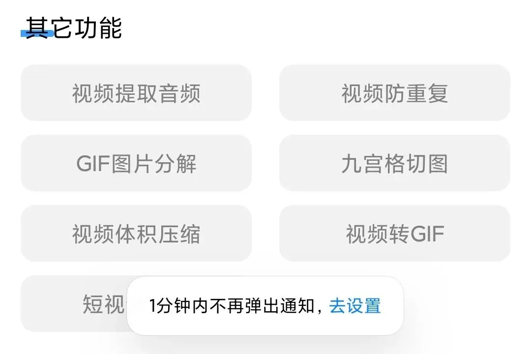 其他功能包含视频转GIF,视频体积压缩,短视频扫描等针对于视频处理的功能