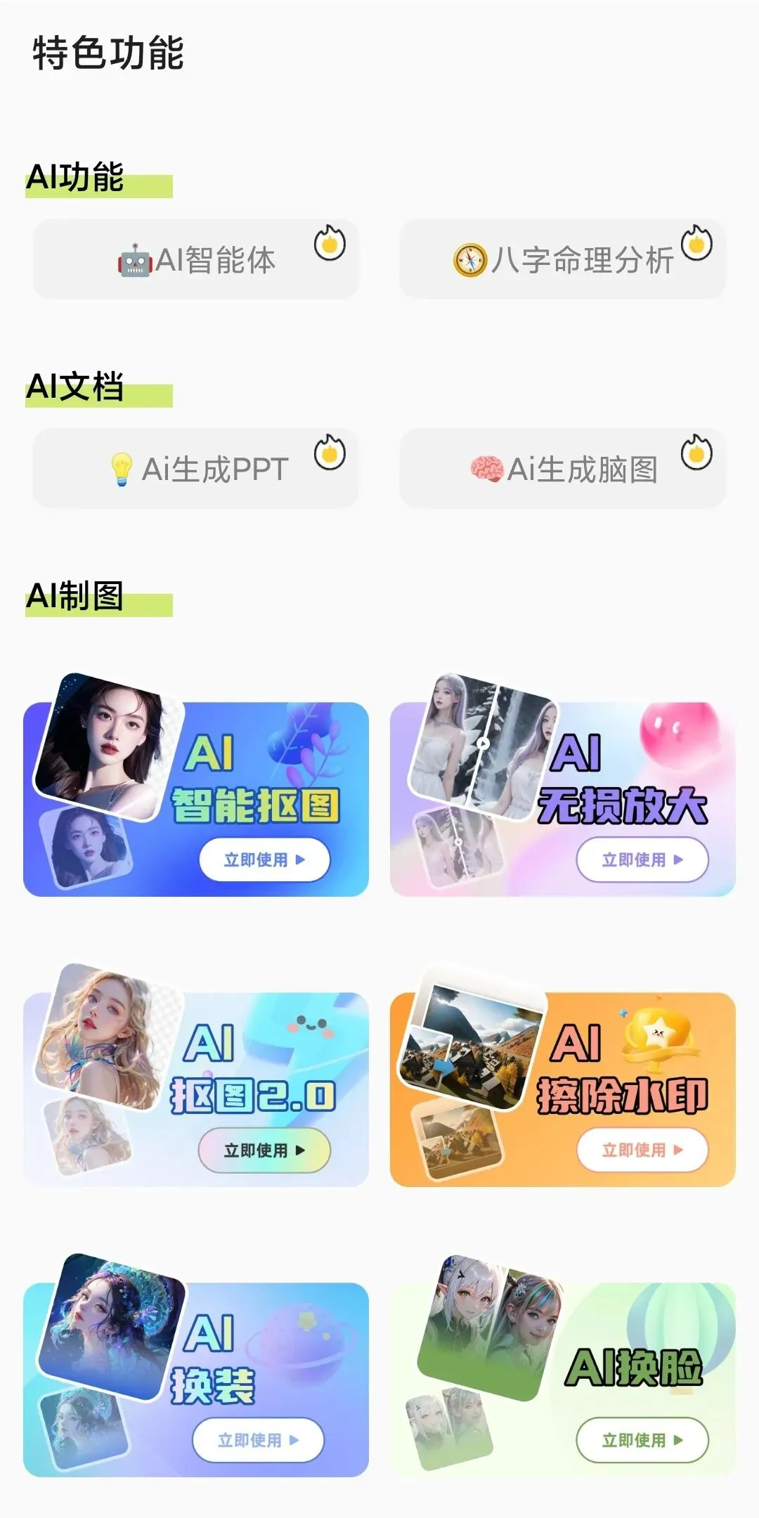 功能专栏全是AI智能特色功能,包含AI抠图,AI去水印,AI换装等趣味AI功能,当然,用的好也是一个生产力工具!