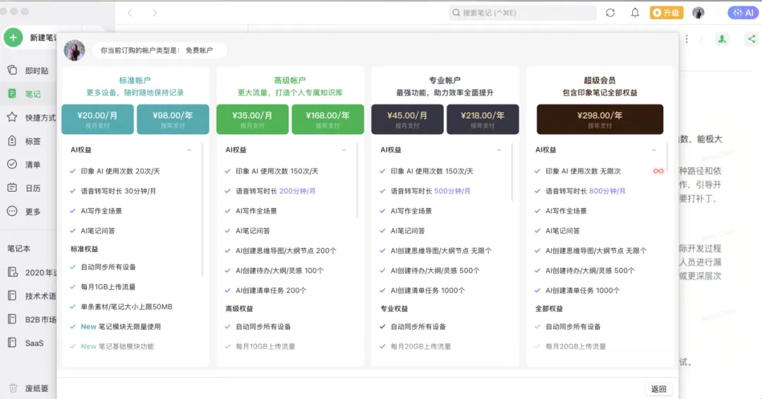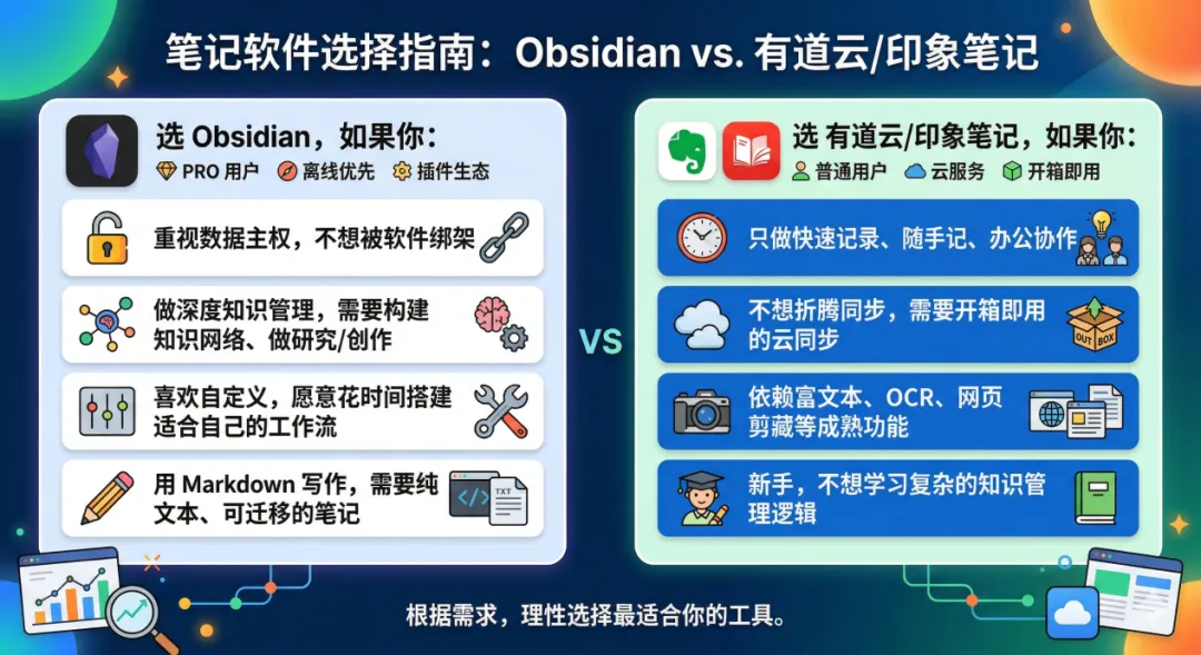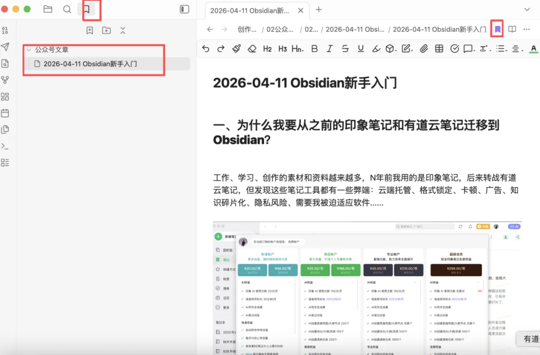 但客观来说,不是非强烈硬推Obsidian(因为不一定适合所有人,它不是一款开箱即用的工具,用户需要了解Markdown语法、会配置插件、并能理解知识图谱的含义),所以我们也看到有道云笔记/印象笔记等笔记工具也有其独特的优势: