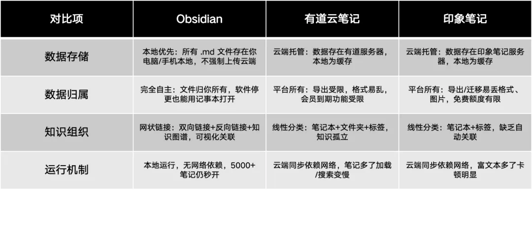 为了方便理解,我们用以下这张表来说明三个笔记工具间的底层逻辑/最本质区别: