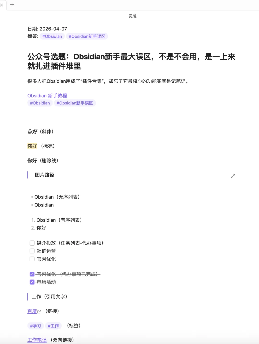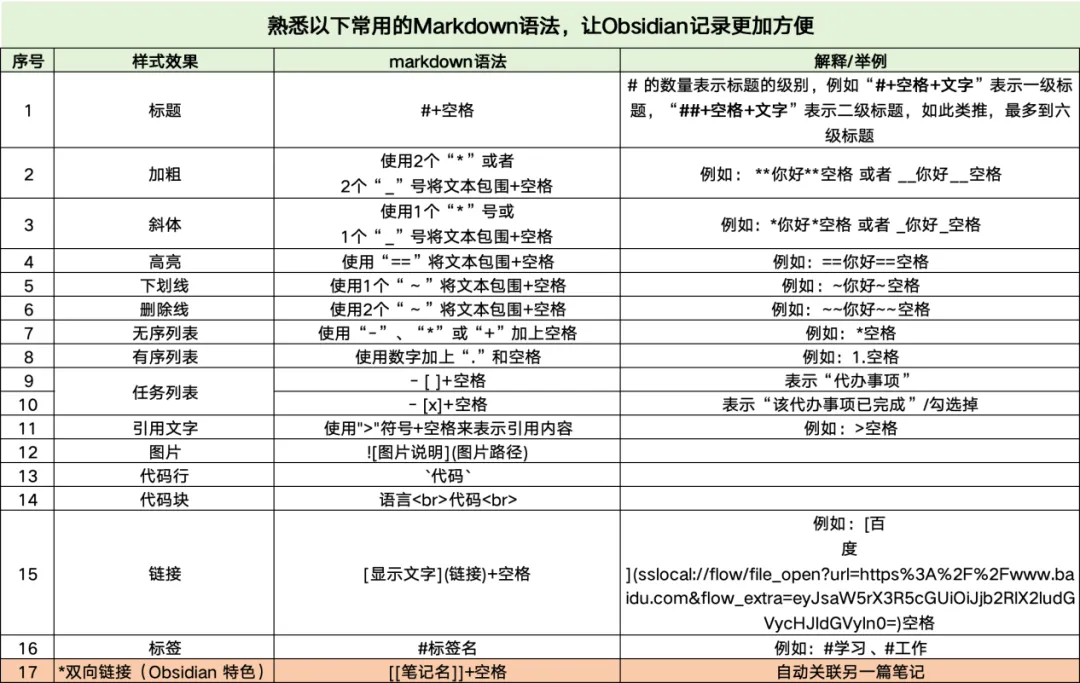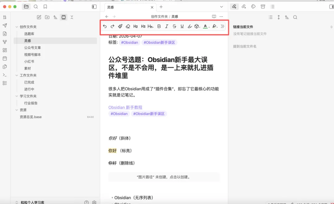 当然你在Obsidian新建的笔记,也完全可以直接像记事本、Word一样纯文字打字输入内容,不用任何语法,完全没问题,照样能保存、能搜索、能双链,Markdown只是可选的排版语法。