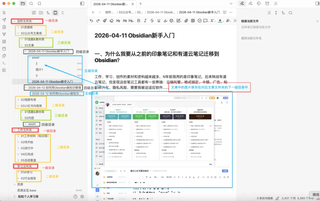 *层级无所谓多少以及没必要一下子就要创建“完美”,后续是可以调整的,新手可以先从创建一级、二级(文件夹、笔记)开始,找找感觉。