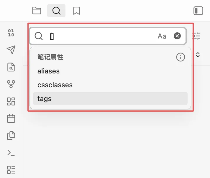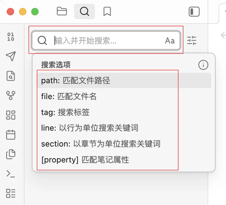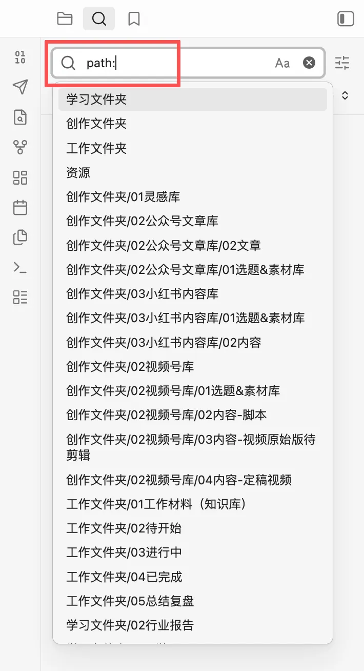 这是Obsidian核心的全局搜索筛选器,用来精准缩小搜索范围,避免大海捞针)。