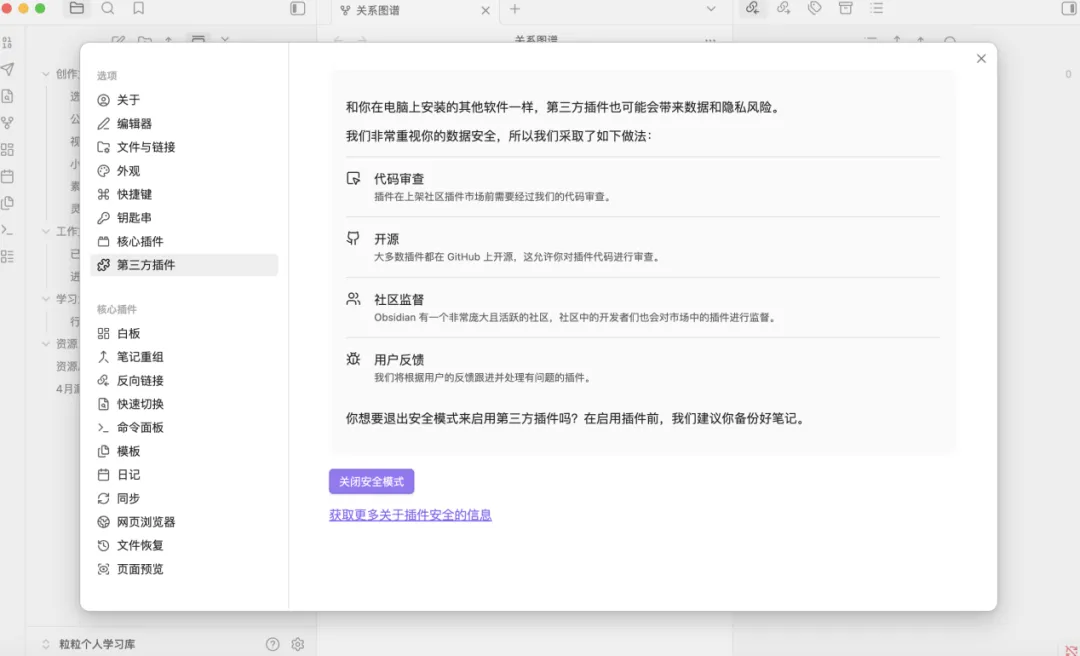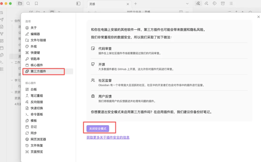这个具体我们后面会讲,这期作为新手来说,我们可以先选择【开启安全模式】,如下图14所示(在【关闭安全模式】下是不能装任何第三方插件,也不能用自定义主题、CSS样式,但初期可以防止你沉迷收藏各种插件而忘了笔记的初衷。