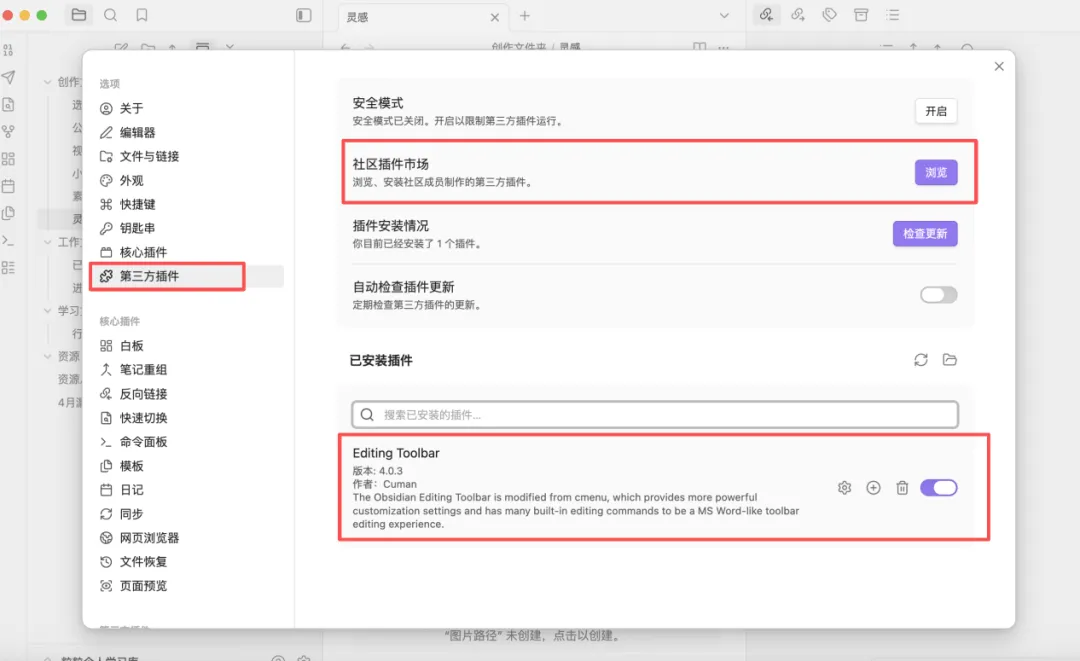 除了【核心插件】,还有【第三方插件】(也叫【社区插件】),如上图13所示,是由Obsidian官方团队以外的全球独立开发者编写,用来给软件额外扩展功能的免费小程序。你可以把它理解为手机里的App、浏览器的扩展(Chrome Extension),或者游戏里的“模组”(Mod)。