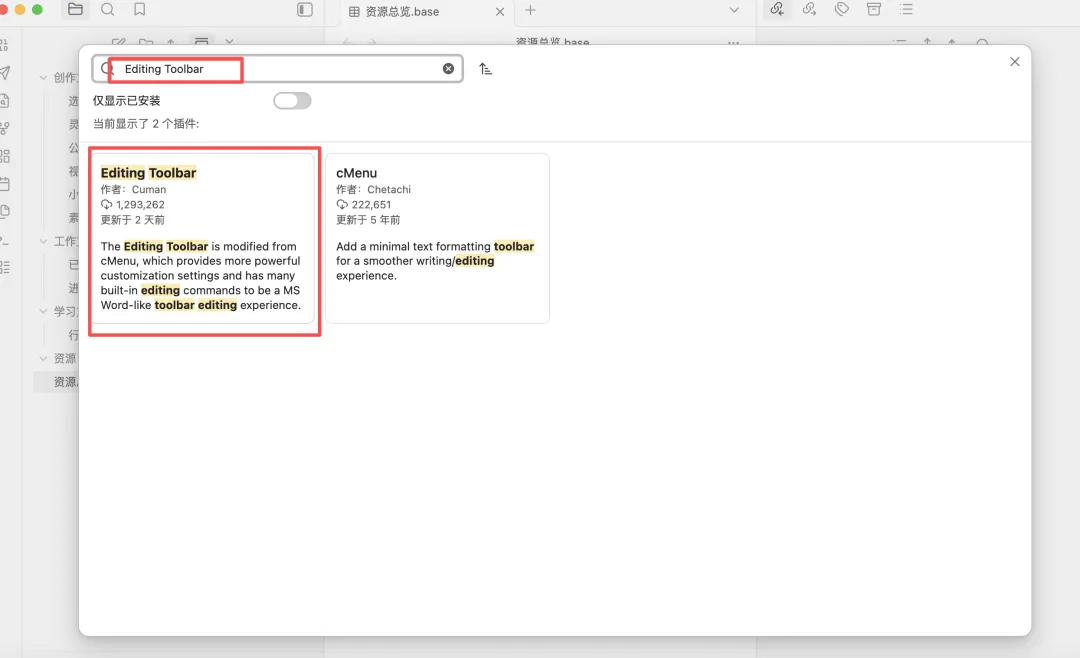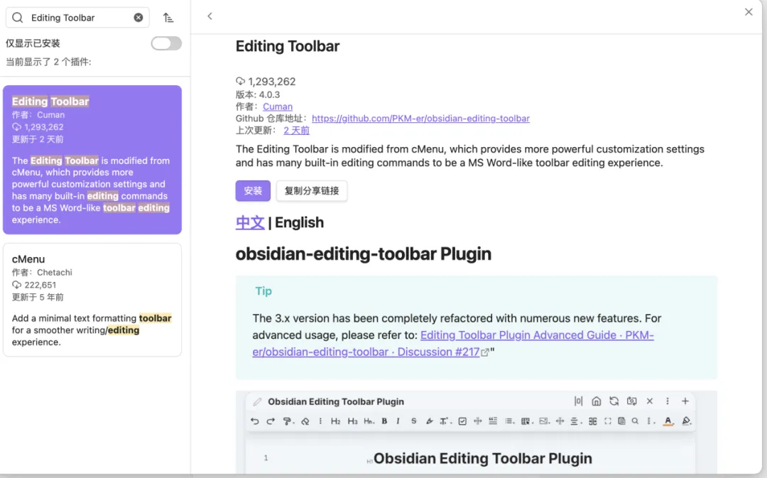 上述提到用Markdown语法进行内容排版,但如果你实在记不清或者用不惯这些语法,那我们就在第三方插件中下载一个名为“Editing Toolbar”编辑工具栏(这是Obsidian里专门给「编辑模式」用的快捷操作栏,帮你不用记 Markdown语法,点按钮就能快速排版)。