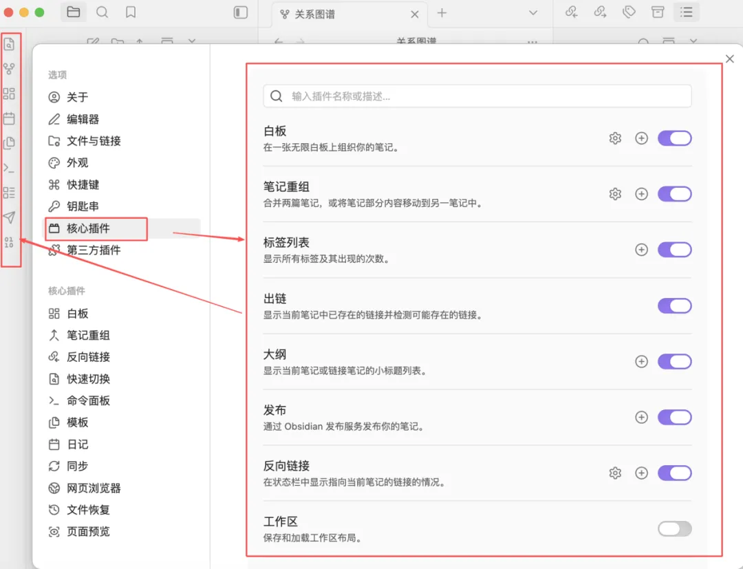 点进去如下图13所示,你可以进行个人需求的配置(比如我这里打开了一些核心插件的开关,那么就会显示在主界面最左侧的【功能按钮】那,而且这里的核心插件是官方出品的,稳定可靠。