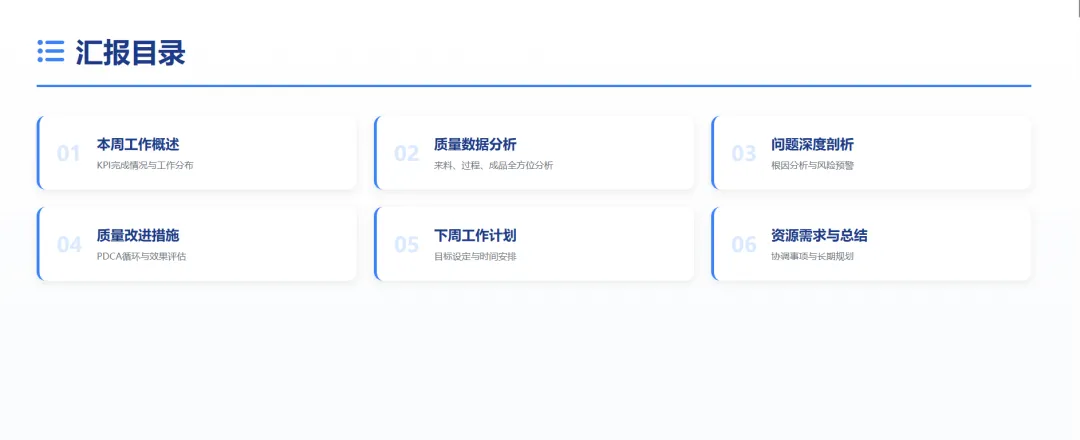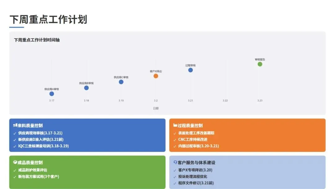 根据本周工作总结和质量分析,制定下周详细的工作计划,明确工作目标、责任人和完成时限,确保各项工作有序推进。