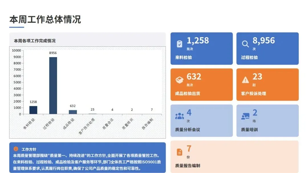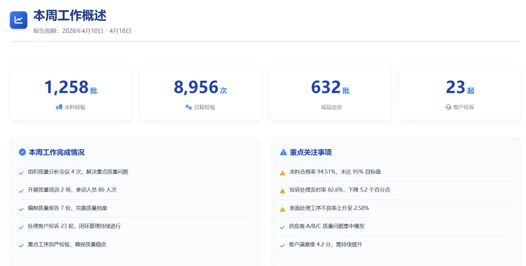 本周共完成来料检验批次1258批,过程检验点位检查8956次,成品检验出货632批,处理客户投诉23起,组织质量分析会议4次,开展质量培训2场,编制质量报告7份。整体质量指标完成情况良好,但仍有部分环节需要持续改进。